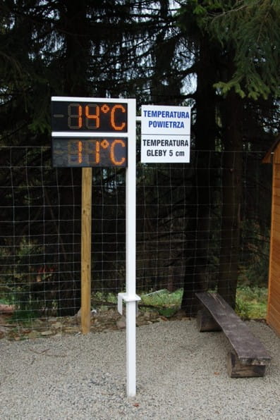 Jeden z nich prezentuje temp. powietrza mierzoną na wysokości 2 m zaś drugi na głębokości 10 cm w gruncie ( czujnik może mierzyć temp. do 40 cm w gruncie). Zestaw zasilany jest napięciem 12-24V. Zestaw można rozbudować od dodatkowe ekrany LED i mierzyć temperaturę w szerszym profilu.